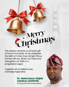 Lagos APC 2027 governorship aspirant, Dr. Abdul-Azeez Olajide Adediran JANDOR extends warm yuletide greetings to APC Leaders and the entire Lagosians, urging everyone to embrace the season as a period of joy, peace, hope and renewed dedication to collective progress.