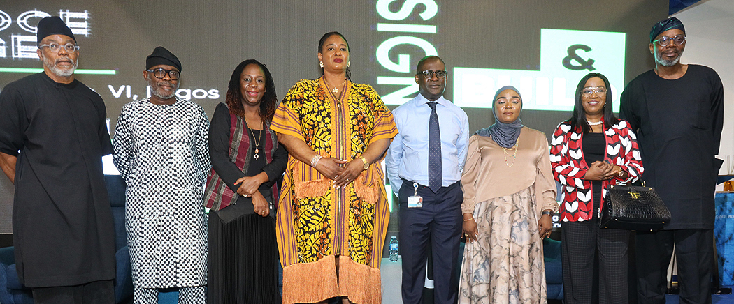 L-R; Creative Director at Patrickwaheed Ltd. Patrick Koshoni; Creative Direcror of NANA Colective,Adeyemo Shokunbi; CEO,National Theatre National and Founder of iDesign, Tola Akerele; representative of Lagos State Governor/CEO, Lagos State Film and Video Censors Board, Bukola Agbaminoja; Managing Director/CEO, Ecobank, Bolaji Lawal; Founder/ceo, Lash Interior, Aishat Lawal; President, Nigerian Institute of Architects, Arc. Mobolaji Adeniyi and MD, Jaza Energy, Adeboye Fowora at the Ecobank Design and Build Exhibition held n Lagos yesterday PHOTO SUNDAY ADIGUN